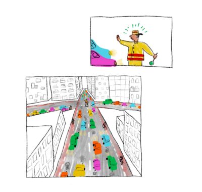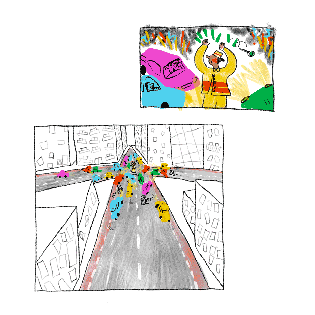Mitch heeft zelf het gevoel dat zijn hoofd erg vol zit. Alsof er heel veel verkeer is dat door elkaar rijdt. Waardoor de verkeersregelaar het niet meer kan overzien.